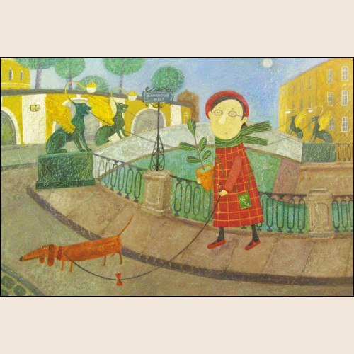 Все таки какие чудесные картинки попадаются на петербургские темы. Да простят меня жители других городов России, я сейчас много просматриваю разных открыток. Вот таких тем с другими городами не встречала, чтобы было видно и что за город , и сюжет какой-нибудь милый или забавный. А у нас сейчас довольно много всякого разного есть. Вот сейчас вышла изумительная серия открыток с картинами Светланы Соловьеовой. При всей фантазийности тут угадываются черты знакомых мест города. Д и герои картин такие родные, местные :) Цветовая гамма очень сейчас мне глаз радует.