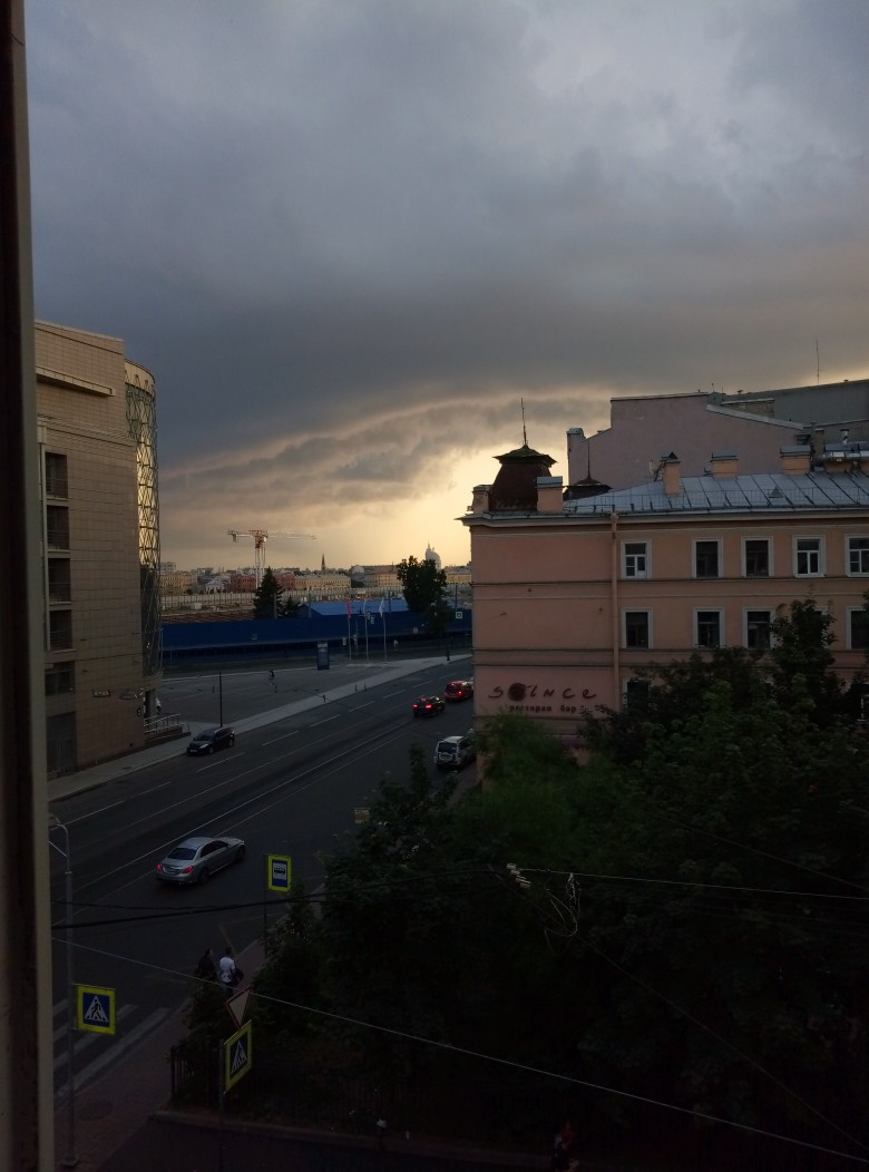 Вчера в Петербурге была гроза и ливень. Хорошо!! А Это туча, принесшая грозу, которая только наползает на город. Фото сделала телефоном из окна подруги.
